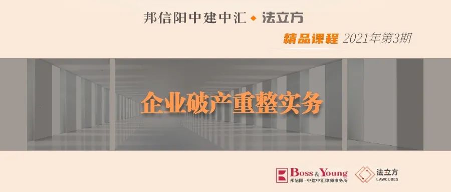 2021年4月6日(周二)18:30,邦信阳中建中汇·法立方精品课程第三期——“企业破产重整实务”准时播出。邦信阳中建中汇陈鹏律师、夏晓萍律师、王斌律师作为第三期课程主讲人、与谈人,将从破产程序、重整方案、常见问题与实务经验等方面,围绕“企业破产重整实务”进行分享。
