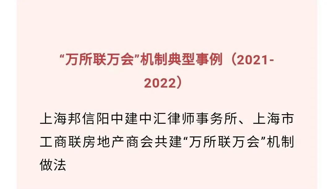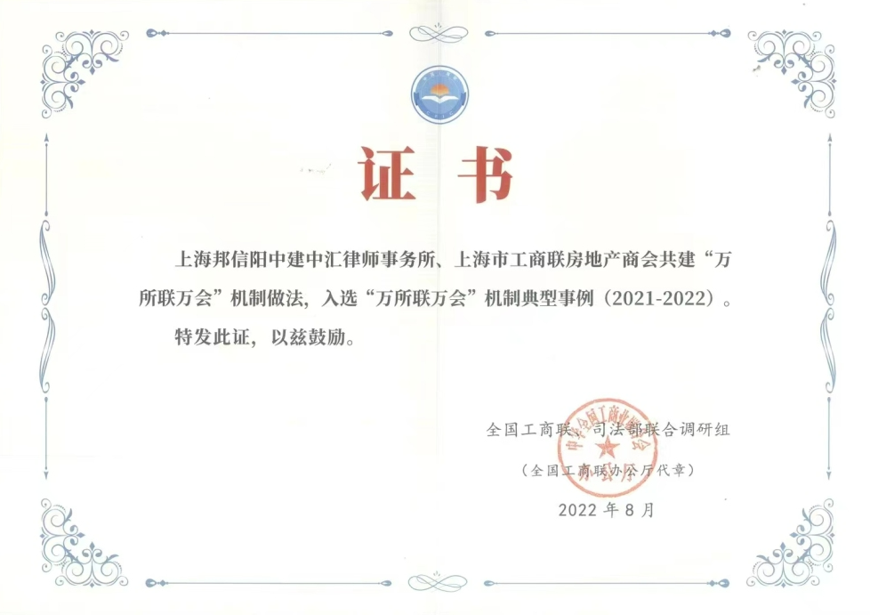 邦信阳中建中汇律师事务所设立28年来,始终秉持“专业、高效、富有创造力”的法律服务精神,为经济发展保驾护航,与上海市工商联房地产商会共同助力营商环境健康发展。