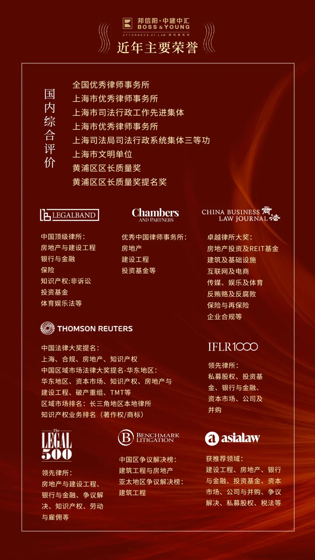 邦信阳中建中汇作为一家大型综合性律师事务所,服务领域全面,涵盖几乎所有法律服务领域,其中在涉外法律事务、房地产与建设工程、金融事务、竞争与反垄断、知识产权、体育娱乐、国际商事仲裁和诉讼、劳动法、媒体与娱乐、争议解决、海事海商、公司合规审查、税务与财富管理、破产等领域处于行业领先地位,在房地产、建设工程和基础设施、房地产投资及REIT基金领域、保险与再保险、合规、知识产权、传媒、娱乐及体育等领域已连续多年受到钱伯斯(Chambers and Partners)、《商法》(China Business Law Journal)、SSQ ALB、The Legal 500、LEGALBAND等知名评级机构的充分认可。