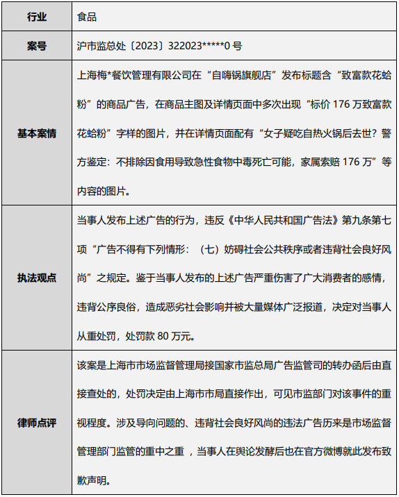 上海市场监督管理局于7月18日公布了2023年上海第二批虚假违法广告典型案例[13],聚焦新修订的《互联网广告管理办法》,重点打击并持续清理查处互联网领域违法广告活动,发布渠道涉及微信公众号、微信小程序、电商平台自营店铺和第三方网店。典型案例包括自嗨锅广告主在网购平台的商品标题、主图及详情页发布“标价176万致富款花蛤粉”,因违背良好社会风尚被处罚80万元、某白酒经销商在短视频平台投放违法广告被处罚20万元等。