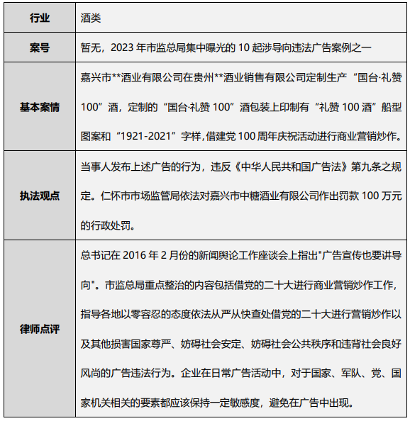 该批集中曝光案例中被处罚金额最高的为浙江省嘉兴市**酒业有限公司,当事人在贵州**酒业销售有限公司定制生产“国台·礼赞100”酒,包装上印制有“礼赞100酒”船型图案和“1921-2021”字样,借建党100周年庆祝活动进行商业营销炒作,因违反《广告法》第九条被贵州省仁怀市市场监管局作出款100万元的行政处罚。在9月8日集中公布的8起涉导向违法广告典型案例中[10],除涉及上述违法行为外,执法部门着重关注的违法行为还包括物化、贬低女性,违背良好社会风尚的行为,在“五个女博士”饮品违法广告案中对广告主北京**博识健康管理有限公司作出罚款40万元的行政处罚;对“自嗨锅标价176万致富款花蛤粉”的广告主梅*餐饮管理有限公司因嘲讽、侮辱死者及其家属,产生极为恶劣的社会影响作出罚没款80万元的行政处罚;以及对发布含有“辟邪、挡煞”“降服一切恶魔”“帮助驱除心魔”等宣扬封建迷信内容广告的广西桂林大*玉石文化有限公司作出罚款20万元的行政处罚。