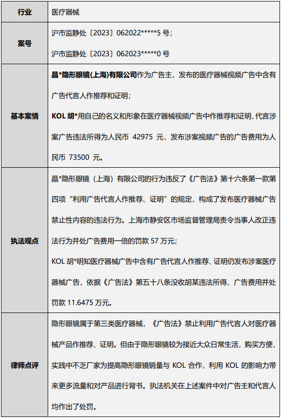 案例1:KOL代言隐形眼镜,品牌方与代言人均被处罚