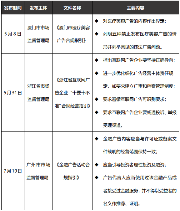除了北京和上海市监局集中发布的一系列针对强监管行业和适应新业态的广告合规指引和规范性文件之外,其他地区市监局也发布了许多值得关注与学习的文件或指引,如: