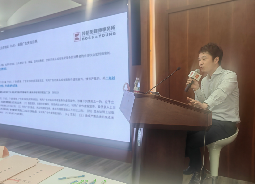 2025年5月23日,邦信阳合伙人杨涛律师应邀参加了上海市农业农村委市场与信息化处指导、市农业广播电视学校承办的培训活动,向上海市各涉农区品牌负责人员、农场主、合作社负责人、新型农业经营主体带头人、农业企业管理者与业务骨干等提供了主题为“企业直播营销合规与品牌保护要点”的培训。杨律师特别针对直播中出现的广告、宣传等内容提供了专业的合规意见,例如,如何在直播合同中保护好企业权益、如何确保直播的内容合法合规、如何处理第三方导致的直播合规风险等。此外,杨律师还从企业商标保护、商业秘密与专利的策略性安排等角度为企业品牌保护提供了专业观点。会上,企业学员积极参与提问,会场讨论氛围积极,企业获得了较为全面的指引与问题解答。