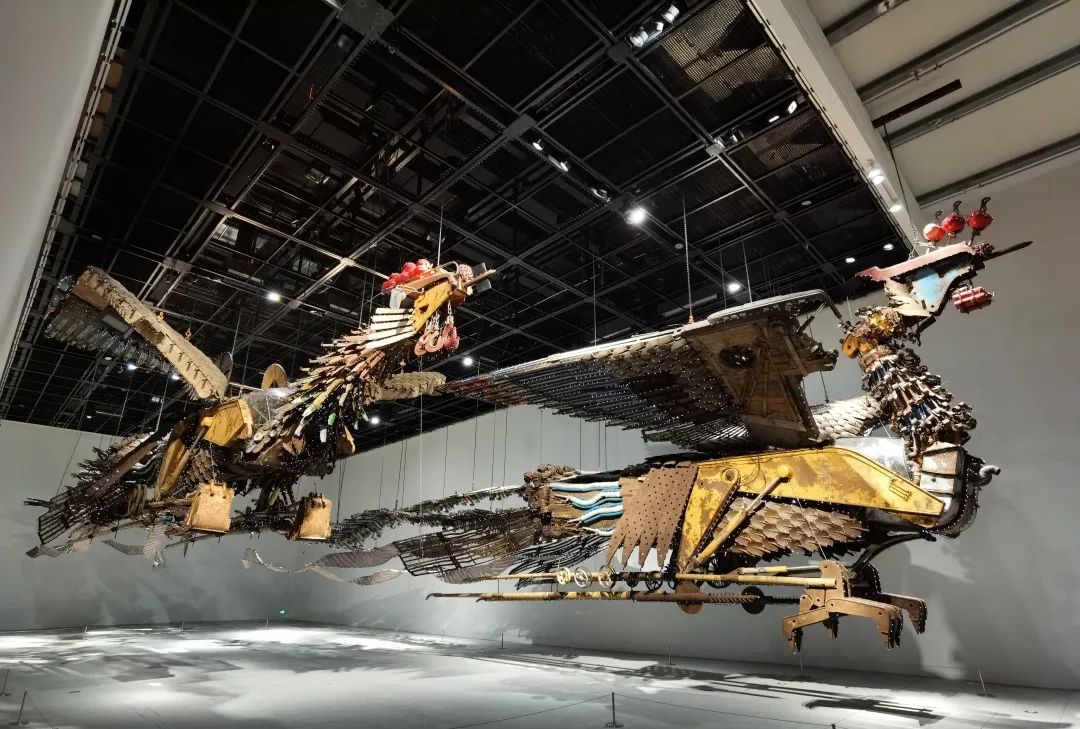 展览最大一件作品是用建筑材料、建筑废弃物、生产设备、劳动工具等创作的大型装置《凤凰》。