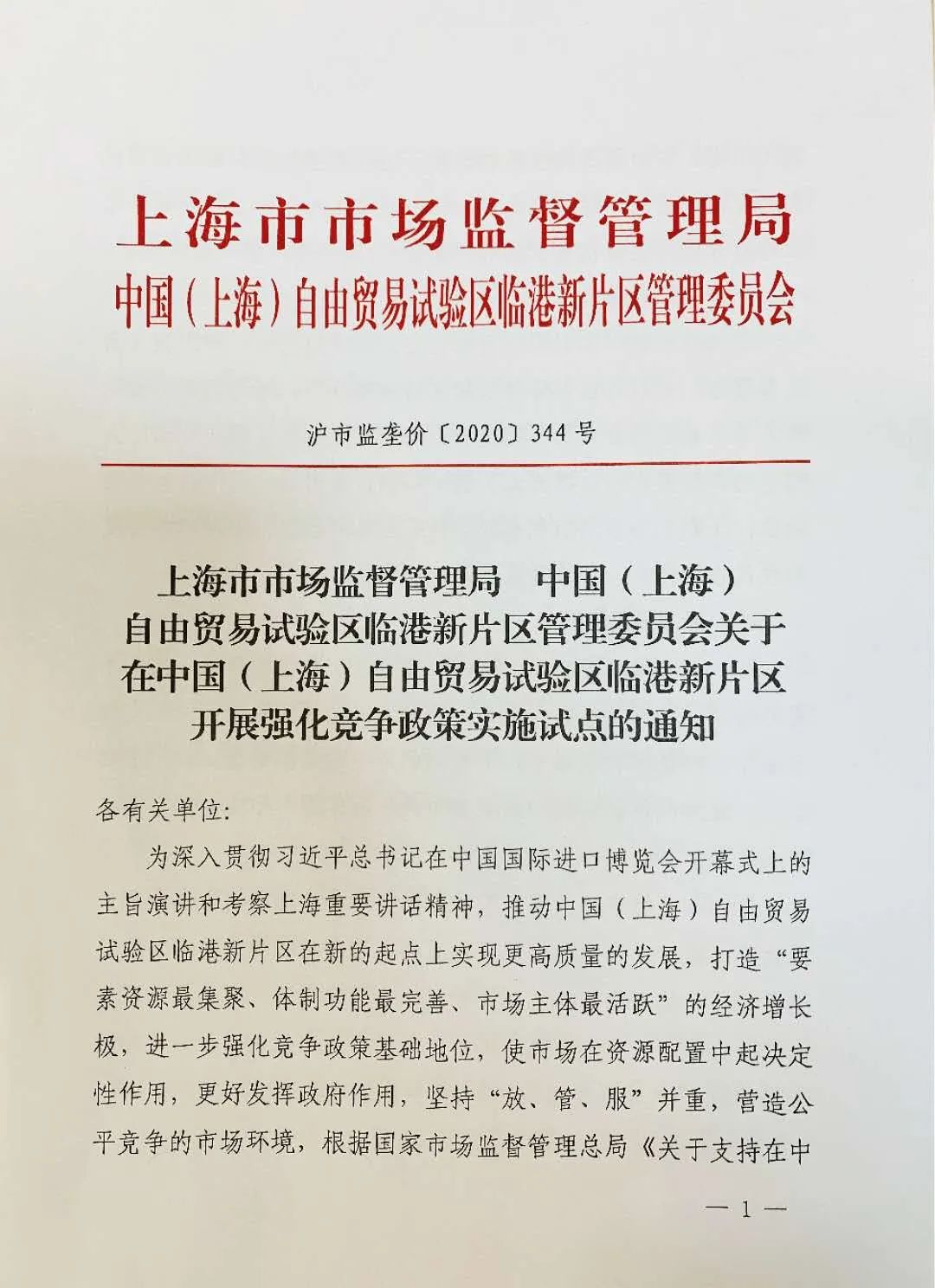 2020年9月1日,在中国(上海)自由贸易试验区临港新片区(“临港新片区”)成立1周年之际,上海市市场监督管理局联合临港新片区管委会在临港新片区隆重举行强化竞争政策实施试点工作启动仪式。