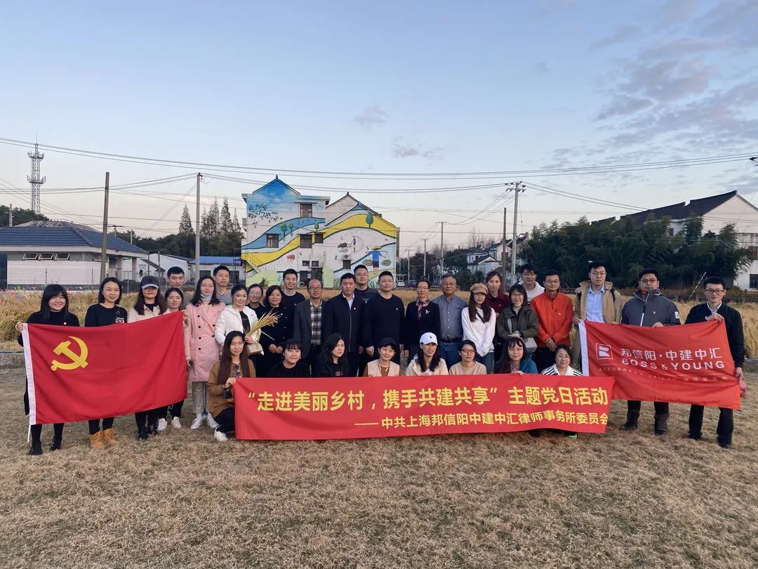 为进一步加强事务所党委与金山区廊下镇党委的党建联建,体验乡村振兴战略下“产业兴旺、生态宜居、乡风文明、治理有效、生活富裕”的乡村新面貌,2021年月11日19日至20日,上海邦信阳中建中汇律师事务所党委领导班子率事务所党员、入党积极分子等三十余人赴金山区廊下镇,开展为期两天的“走进美丽乡村,携手共建共享”主题党日活动。