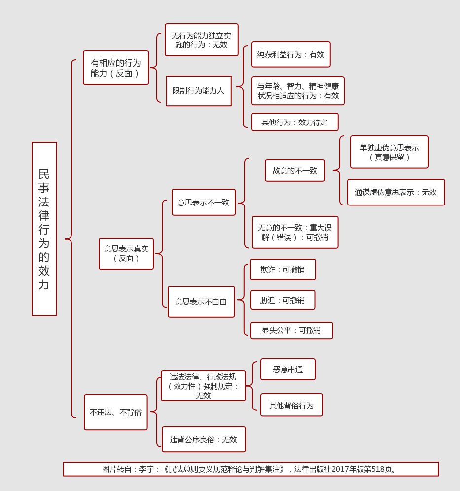 《民法总则》第一百四十三条规定了民事法律行为的有效条件,即:行为人具有相应的民事行为能力;意思表示真实;不违反法律、行政法规的强制性规定,不违反公序良俗。李宇老师指出,事实上第一百四十三条的内容不应得到过度的重视,但其确实是本节的提纲挈领性的条文,民法总则第一百四十四条至一百五十四条的11条条文看似混乱实则是对一百四十三条反面后果的展开。