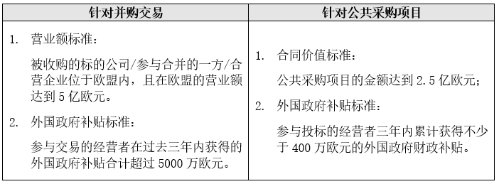 简而言之,《外国补贴条例》规定了企业事前申报制度以及欧盟委员会依职权主动调查制度。在满足相应申报标准的情况下,企业须向欧盟委员会就相关并购交易及公共采购项目进行事先申报;针对不满足申报标准的并购交易或公共采购项目,欧盟委员会有权主动发起调查。