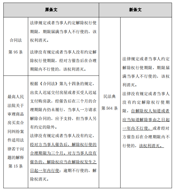 民法典第564条规定了解除权行使的1年除斥期间,对于法律没有规定或者当事人没有约定除斥期间的情况,解除权人将受到知道或者应当知道解除事由之日起1年内行使解除权的限制。该规定借鉴了最高人民法院《商品房买卖合同司法解释》第15条的规定,将原先仅适用于商品房买卖合同的规则拓展适用于所有合同,解决了合同解除权除斥期间不确定的问题。