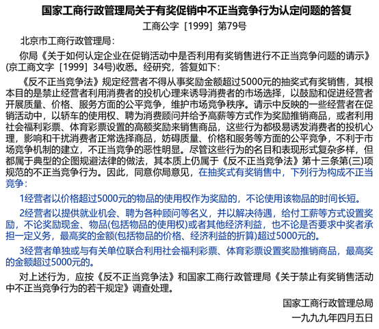 执法机关认定:该公司的上述行为,违反了《反不正当竞争法》第十条:“经营者进行有奖销售不得存在下列情形:(一)所设奖的种类、兑奖条件、奖金金额或者奖品等有奖销售信息不明确,影响兑奖;”的规定,决定责令停止违法行为,并罚款人民币贰万圆整。