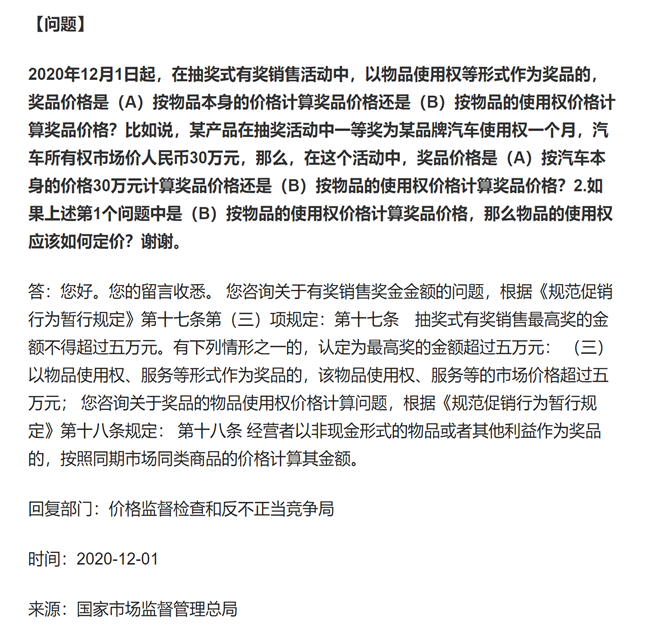对于该问题,我们有同事通过留言方式咨询国家市场监管总局,国家市场监管总局的回复意见如下: