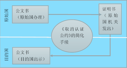 公约取消了领事认证,代之以附加证明书的方法。附加证明书是指由文书发出国主管机关签发的,符合公约所附示范格式并放置在文书或文书附页上的附注,用于证明文书上签名、印章或戳记的真实性。附加证明书是公约在取消认证后,证实原始公文书出处而创设的一套制度。其像领事认证一样,仅限于验证公文书签章的真实性,而并非证实原始文书内容的真实性。依据该制度,在缔约国领土内作成而需在另一缔约国领土内出示的公文书,如其附有签发国主管机关签发的附加证明书,则使用国应免除对公文书的认证手续。公约将多重、连锁的领事认证程序改成一步式证明程序,具体如下图: