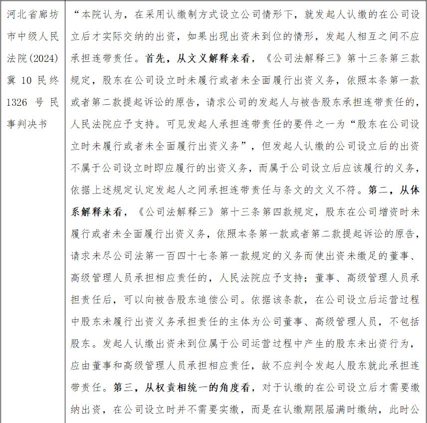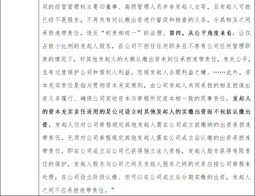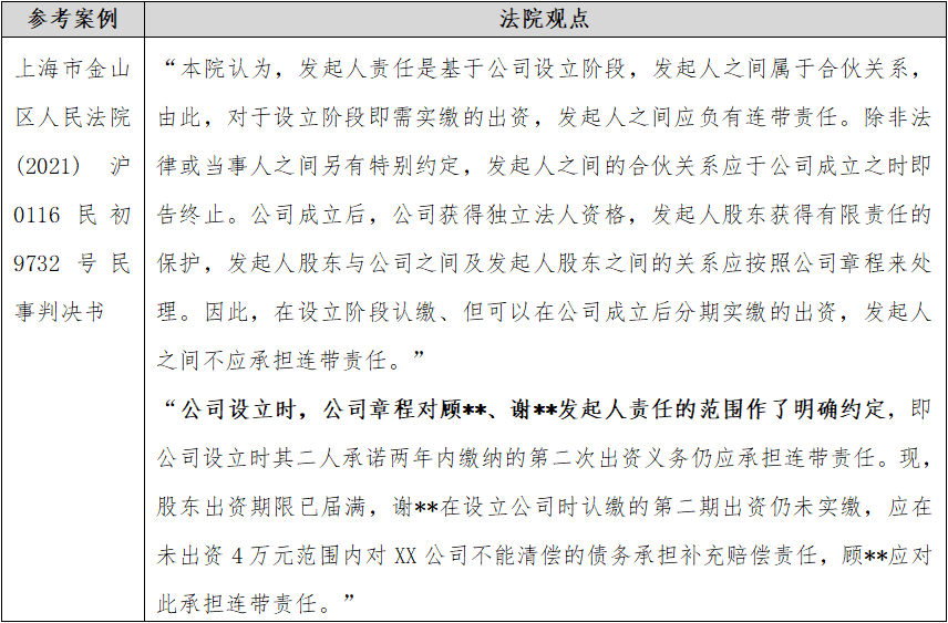 [1] 我们理解,之所以不少客户对此问题产生困惑,是因为在新《公司法》施行前,不少法院裁判认为,即使公司采用认缴方式设立,发起人连带责任的范围亦为初始章程规定的发起人认缴出资额,包括公司设立时认缴、公司成立后实缴的出资(参见(2016)最高法民申3764号、(2021)京01民终3363号、(2019)京民申5584号、(2019)京0108执异588号、(2019)京0108执异497号、(2023)浙0108民初4411号裁判文书)。现新《公司法》已对此问题进行了澄清与明确。