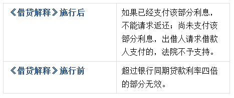 《借贷意见》第六条 民间借贷的利率可以适当高于银行的利率,各地人民法院可根据本地区的实际情况具体掌握,但最高不超过银行同类贷款利率的四倍(包含本数)。超出此限度的,超出部分的利息不予保护。