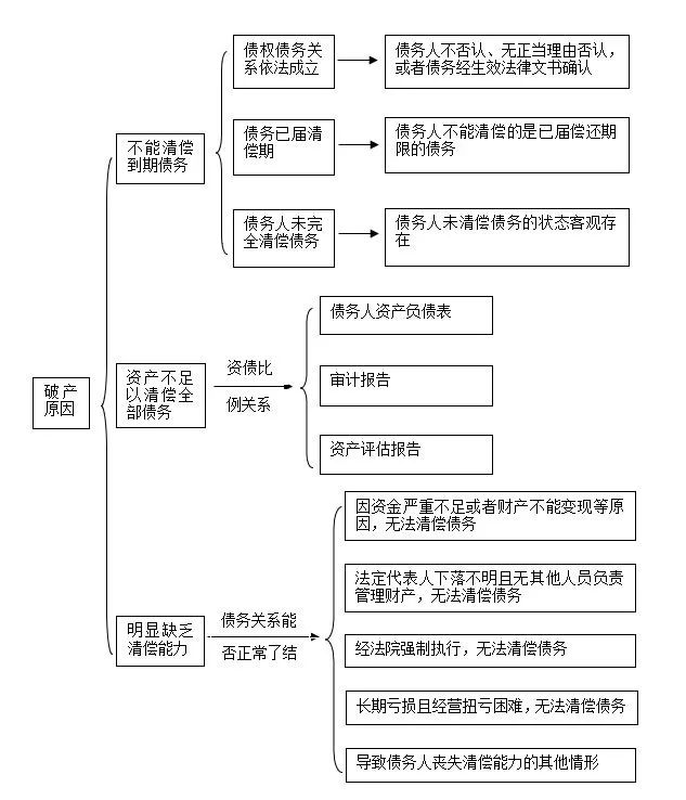 《中华人民共和国企业破产法》(下称“《破产法》”)第2条第1款规定:“企业法人不能清偿到期债务,并且资产不足以清偿全部债务或者明显缺乏清偿能力的,依照本法规定清理债务。”根据该条可知,我国企业法人破产的原因有两个:“不能清偿到期债务,并且资产不足以清偿全部债务”或者“不能清偿到期债务,并且明显缺乏清偿能力”。以上两个破产原因均有两个要素合并构成,且两种原因中均包含“不能清偿到期债务”这一要素。