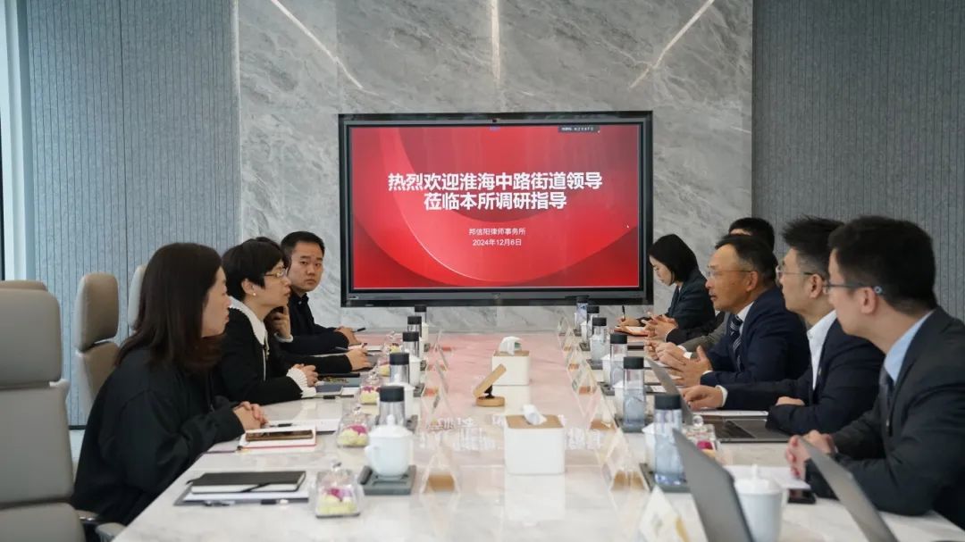 12月6日上午,淮海中路街道党工委书记陆晓钧一行莅临邦信阳律师事务所开展调研工作。邦信阳律师事务所主任杜爱武律师、邦信阳律师事务所党委书记赵亮波律师、邦信阳律师事务所党委副书记戴天骁律师、邦信阳律师事务所管委会成员施磊律师、邦信阳律师事务所管委会成员徐志杰律师等人接待并参与调研会议。